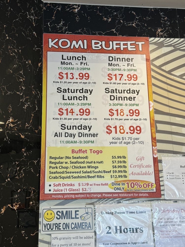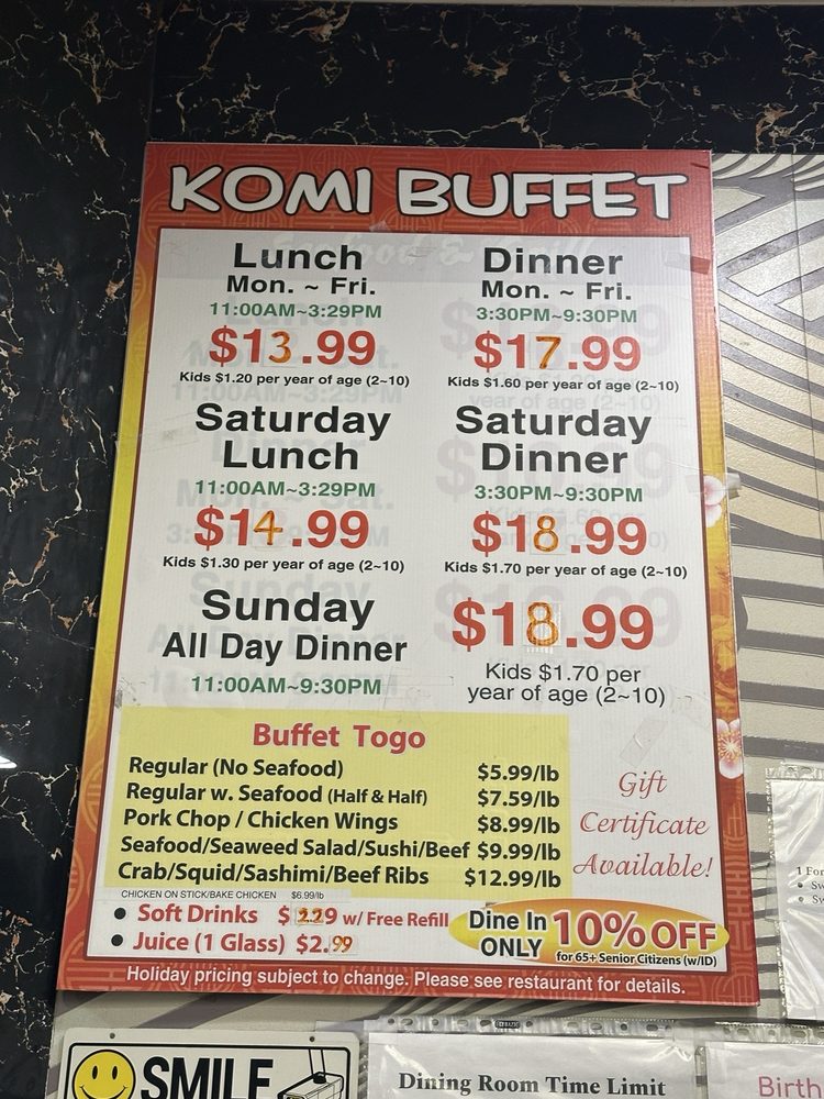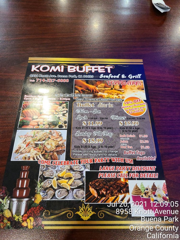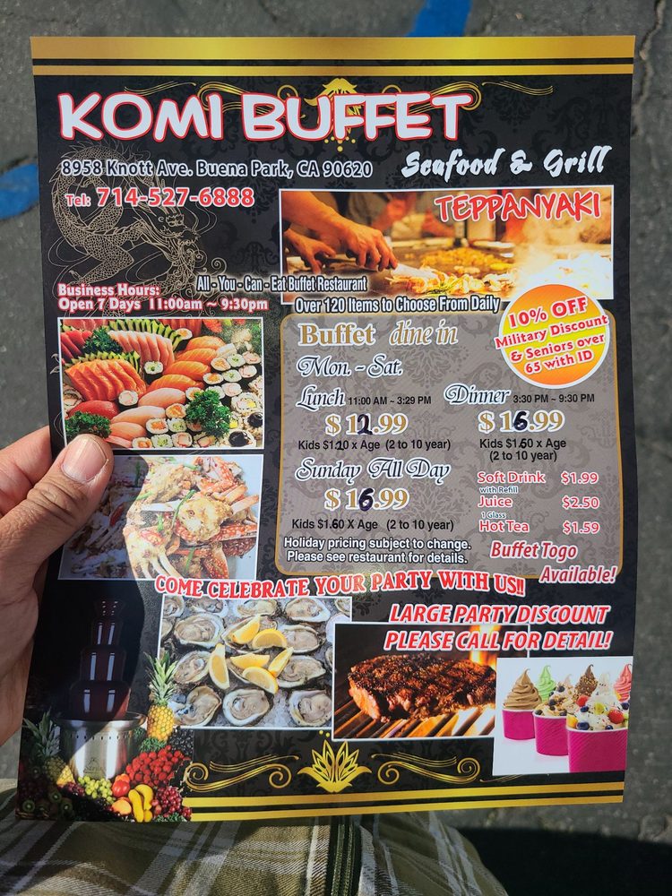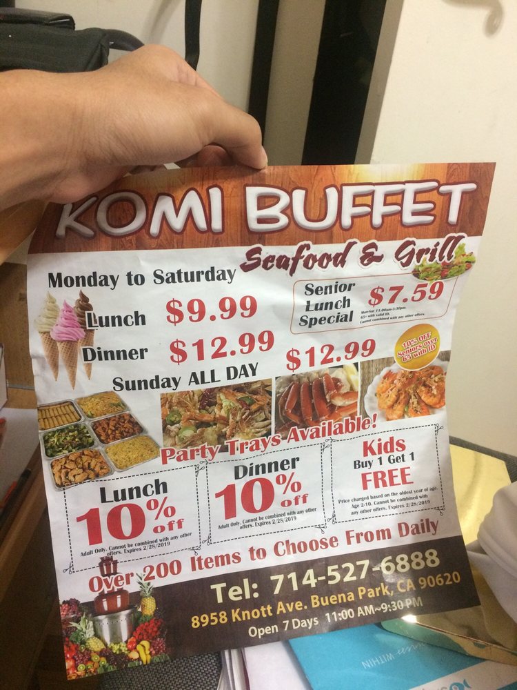 Welcome to Komi Buffet, a Chinese and seafood buffet located in Buena Park, CA. Offering takeout, reservations, delivery, and a variety of vegan and vegetarian options, Komi Buffet is a budget-friendly choice for a satisfying meal. Customers praise the diverse menu, including options like sushi, grilled salmon, lobster bake, orange chicken, and unique ice cream flavors. The buffet also features favorites like baked scallops, dry fry chicken wings, and crab cheese rangoons. Despite some concerns about seafood freshness, overall, customers appreciate the value for money and accommodating service. With a clean environment, free parking, and a range of food choices from savory to sweet, Komi Buffet is a must-visit for those looking for a casual dining experience with a wide selection of dishes.